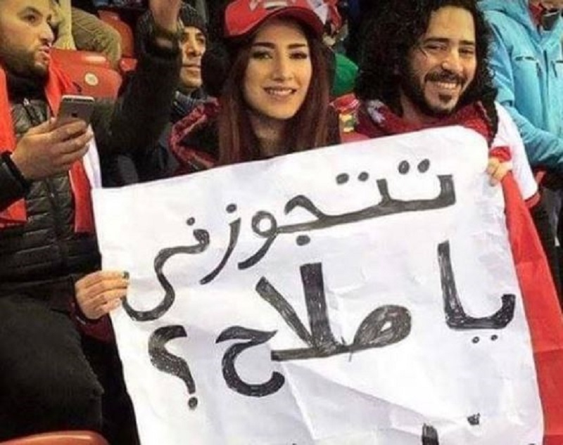 وحسب «العربية نت» تداول مغردون بمواقع التواصل في مصر صوراً للشابة التي كانت تجلس في مدرجات الجماهير المصرية خلال مباراة منتخبها الوطني مع البرتغال، ورفعت لافتة تطلب فيها الزواج من محمد صلاح، وكتبت فيها باللهجة المصرية «تتجوزني يا صلاح».