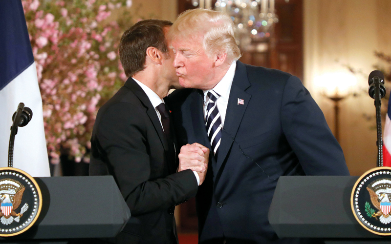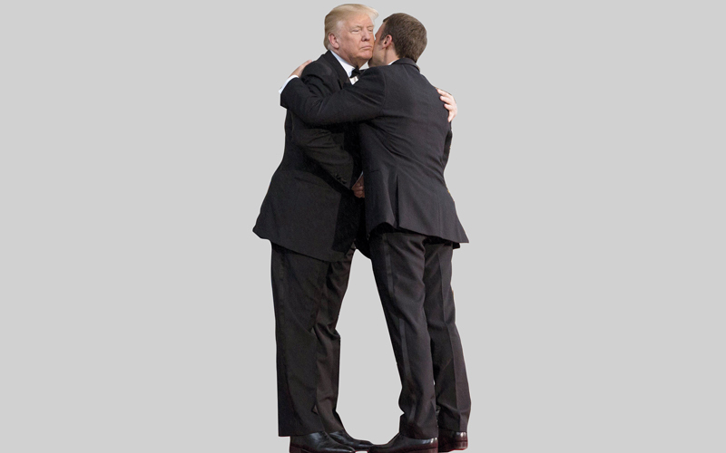 جلب الرئيس الأميركي، دونالد ترامب، مرة أخرى السخرية بسبب تصرفاته الخرقاء، خلال لقائه بأحد زعماء العالم، وهو هذه المرة الرئيس الفرنسي، إيمانويل ماكرون. وصافح ترامب ضيفه في البيت الأبيض بطريقة أثارت سخرية الحضور، قبل أن يزيح من على بذلته قشرة رأس ضيفه في حركة استقطبت استهجان الجميع، وعلق ترامب على ذلك قائلاً «لدينا علاقات خاصة جداً، دعني أزيح هذه القشرة من على بذلتك، وعلينا أن نجعل الوضع جيداً، إنه شخص جيد»، ثم جرّ ضيفه لقبلة «خرقاء» في الخد على النمط الأوروبي، خلال مؤتمر صحافي في البيت الأبيض، الثلاثاء الماضي، استقطبت أيضاً الضحكات من الصحافيين، ثم صرح ترامب بعد ذلك بقوله «أحب هذا الرجل كثيراً». وبعد المؤتمر الصحافي سحب ترامب ضيفه من يده بعيداً عن الصحافيين ما أثار أيضاً التعليقات الساخرة على مواقع التواصل الاجتماعي. ترامب فعل الشيء نفسه مع رئيسة الوزراء البريطانية، تيريزا ماي، خلال زيارتها في يناير للبيت الأبيض. وتحدثت ماي بصراحة في تلك الحادثة قائلة «كنت أعتقد أنه سلوك مهذب، لكن عندما بدأنا نمشي على الممر قال لي إن هذا ربما يكون سلوكاً أخرق»، ويبدو أن السيدة الأميركية الأولى، ميلانيا ترامب، ظلت تعاني أيضاً من «قبضة» يد ترامب «الخرقاء» خلال استقبالهما للرئيس الفرنسي وزوجته.