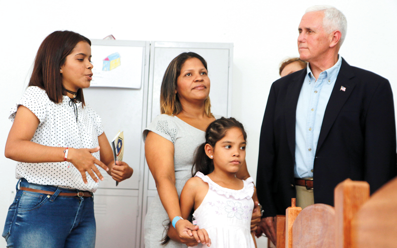 بنس خلال زيارة إلى مركز لإيواء المهاجرين الفنزويليين في ماناوس شمال البرازيل. أ.ب