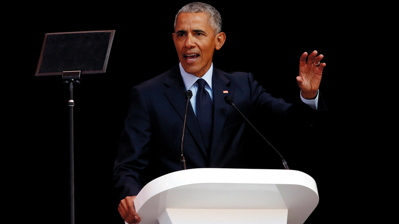 انتهز الرئيس الأميركي السابق، باراك أوباما، أول من أمس، فرصة إلقائه خطاباً في مناسبة تكريمية للزعيم الإفريقي الراحل، نيلسون مانديلا، للتحذير من «أوقات غريبة وغامضة» يمرّ بها العالم، في ما يمكن اعتباره هجوماً مقنّعاً على خَلَفه دونالد ترامب.