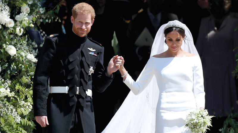 ميغان مع زوجها وهي بثوب زفافها المطرّز بـ53 زهرة عدد دول الكومنويلث. غيتي