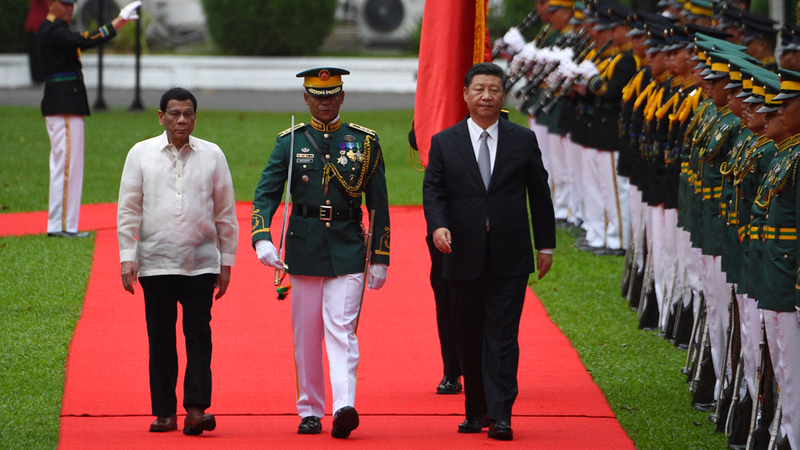 الرئيس الصيني يستعرض حرس الشرف الفلبيني. أ.ف.ب