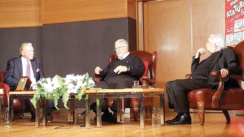مجدت جيزين (في الوسط) ومتين أكبينار (إلى اليمين) خلال الحوار. أرشيفية