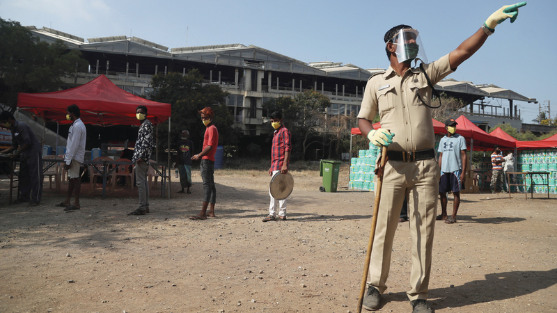 رجل شرطة هندي يقف في حراسة وتنظيم طابور من العمال المهاجرين، الذين اصطفوا للحصول على وجبة طعام مجانية داخل مخيم أقيم لهم خصيصاً في مومباي.