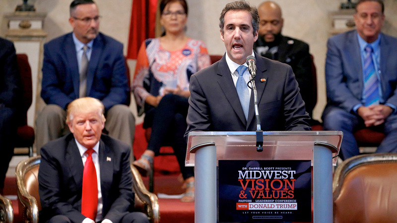 مايكل كوهين يخطب في أحد اللقاءات بحضور ترامب. أرشيفية