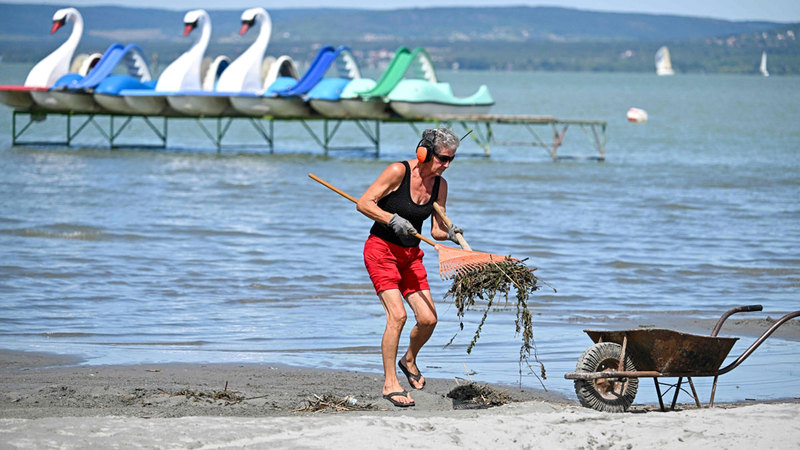 صورة تُظهر عاملاً محلياً ينظف ضفة بحيرة بالاتون على شاطئ بلدة بالاتونفولدفار في المجر. وتجذب بحيرة بالاتون الفيروزية، وهي الأكبر في أوروبا الوسطى، العائلات كل صيف، ولكن الشواطئ والمخيمات المفتوحة يتم استبدالها تدريجياً بالفنادق الفاخرة والمناطق الخاصة.