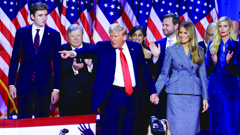 دونالد ترامب وزوجته ميلانيا وابنهما بارون (يسار) خلال فوز ترامب بالانتخابات. إي.بي.إيه