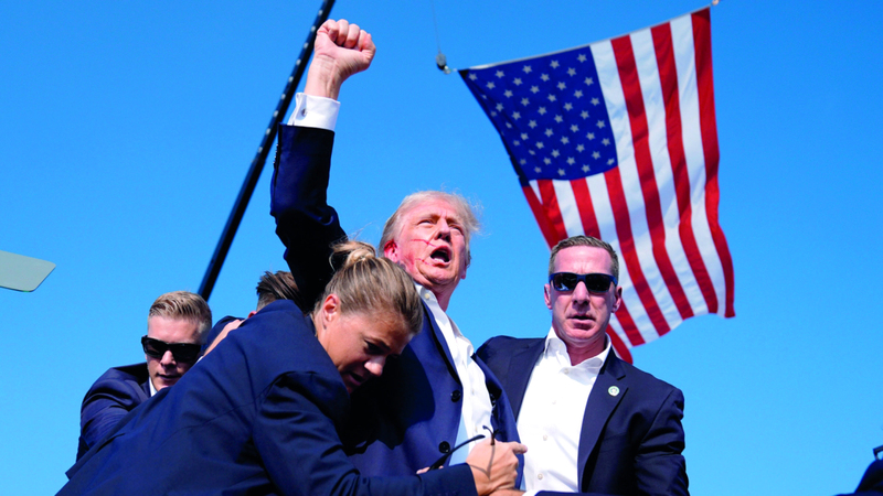 وتُظهر اللوحة الجديدة الرئيس ترامب محاطاً من قِبَل فريق من عملاء الخدمة السرية، بينما يرفرف العلم الأميركي في سماء زرقاء صافية خلفه، ويسيل الدم على وجهه.