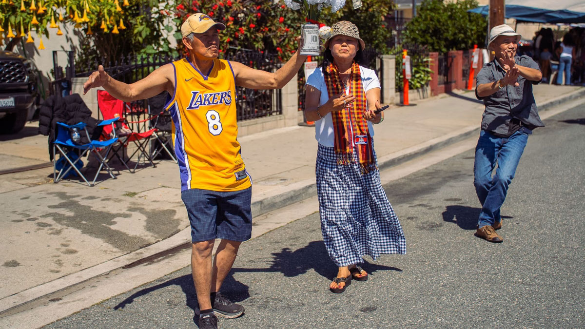ورد عليه مئات المشاركين في الشارع بعبارة «عام جديد سعيد»، مجسدين وحدة الجالية الكمبودية التي تجمعت بالآلاف في شوارع بلدة «كمبوديا» بمدينة لونغ بيتش في ولاية كاليفورنيا الأميركية، بمناسبة السنة الكمبودية الجديدة.