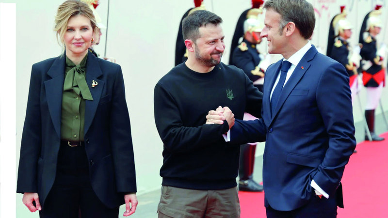 خلال لقاء زيلينسكي وزوجته مع ماكرون في كييف. أ.ب