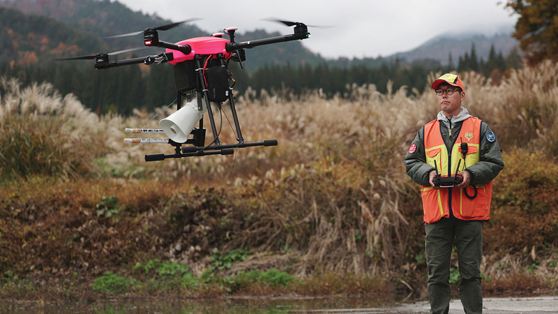 بدأت محافظة جيفو اليابانية استخدام جهاز أطلق عليه مطوروه «مسيّرة الصيد» لردع الدببة، وأصدرت المُسيّرة صوت نباح كلاب عالياً أثناء تحليقها فوق بستان تعرض أخيراً لظهور متكرر لهذه الحيوانات البرية، وفي مرحلة ما، يُمكنها إطلاق مفرقعات صوتية لإبعاد الدببة عن المنطقة.
