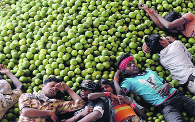 عمال هنود أرهقهم العمل في جمع الليمون فناموا على كومة من هذا المحصول في حيدر آباد.