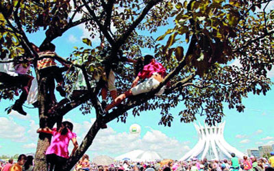 برازيليون يتزاحمون، وقد اعتلى بعضهم شجرة، لإلقاء نظرة على نصب أزيح عنه الستار في العاصمة برازيليا، بمناسبة احتفالات الذكرى الـ50 لتأسيس المدينة التي تعتبر العاصمة الأكثر عصرية وحداثة في أميركا اللاتينية.
