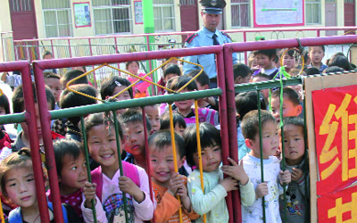أطفال صينيون خلف سور في روضة بمقاطعة هينان ينتظرون آباءهم لاصطحابهم إلى المنزل في ظل مخاوف تسود البلاد من تكرار مذبحة قتل فيها أخيرا أطفال عدة من شخص مختل نفسياً.