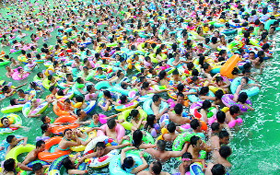 مئات من الصينيين في بركة ضخمة هرباً من موجة الحر الشديد التي ضربت 13 إقليماً صينياً في الأيام الأخيرة.