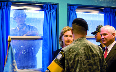 أحد الحراس الكوريين الشماليين يراقب عبر الزجاج وزيرة الخارجية الاميركية هيلاري كلينتون خلال زيارتها مبنى مراقبة الهدنة بين شطري كوريا، وهي تتحدث الى احد الضباط ضمن زيارتها لكوريا الجنوبية.