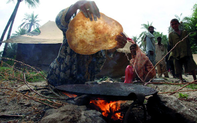 بسبب كارثة الفيضانات التي نكبت بها باكستان تحولت المواد الغذائية إلى سلعة في غاية الأهمية والندرة، وأصبح الخبز مسألة حياة أو موت وتبدو هنا إحدى المشردات في معسكر بولان للنازحين في مقاطعة بلوشستان وهي تحضر الخبز لأسرتها.