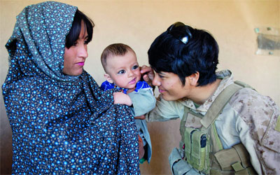 جندية أميركية من الفرقة الثامنة تداعب رضيعة أفغانية بصحبة والدتها، خلال حملة تشارك فيها نحو 50 مجندة في قرية بودوك بمحافظة هلمند.