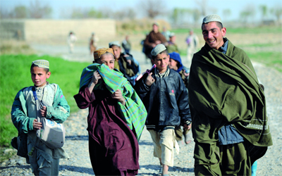 تلاميذ أفغان عائدون من مدرستهم في إقليم هلمند، غير عابئين بالجنود الأميركيين، الذين يقومون بتمشيط المنطقة.