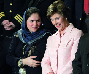 كوفي مع لورا بوش.. وفي الإطار صورة غلاف الكتاب الذي يتحدث عنها.