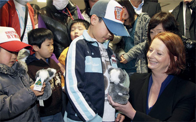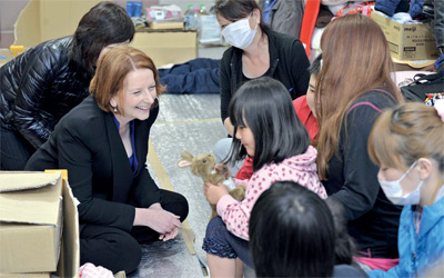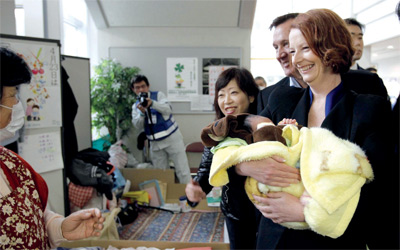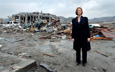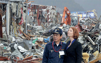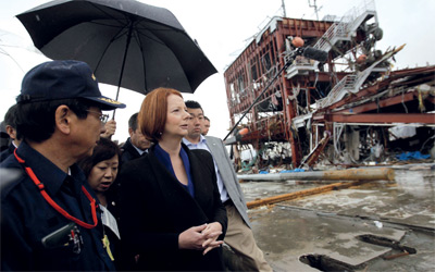 تفقدت رئيسة وزراء أستراليا، جوليا غيلارد، أمس، بلدة ميناميسانريكو في مقاطعة مياجي الساحلية شمال شرق اليابان، التي دمرها زلزال وموجات مد عاتية «تسونامي» في 11 من مارس الماضى. وذكرت التقارير الصحافية اليابانية أن غيلارد زارت البلدة برفقة وزير الخارجية اليابانى تاكيكي ماتسوموتو . وتعد غيلارد، التي وصلت إلى اليابان يوم الأربعاء الماضى، أول زعيمة تزور المنطقة المنكوبة، واللاجئين فى مخيم طوارئ، وقدمت هدايا إلى الأطفال.