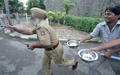 طلبة هنود يلاحقون ضابط «ليتسولوا » منه مصروفاتهم الجامعية، في حركة احتجاجية على ارتفاع المصروفات في 182 كلية.