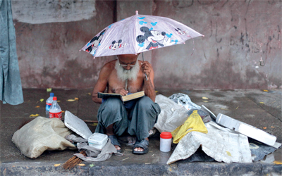 عجوز يقرأ القرآن في أول أيام شهر رمضان المبارك على الرصيف في مدينة لاهور الباكستانية، وقد أمسك بمظلته لتقيه المطر.