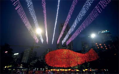 مجسم لسمكة عملاقة مكون من 2500 مصباح (لمبة) في إطار احتفالات مهرجان منتصف الخريف السنوي في هونغ كونغ.