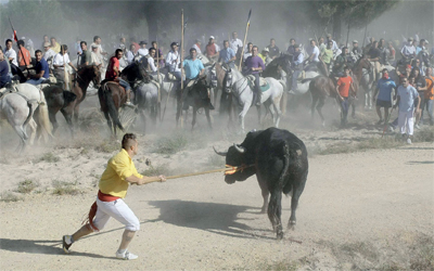 رجل يصارع أحد الثيران في مهرجان «تورو دي لافيغا» بمدينة بلد الوليد الإسبانية.