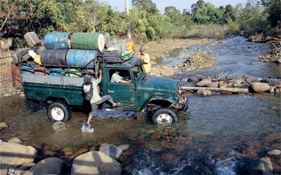 قروي في إحدى قرى ميانمار يحاول الصعود إلى الشاحنة، والمرور عبر نهر صغير.