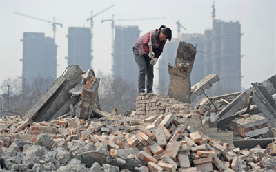 امرأة تنبش في الأنقاض بالقرب من مشروع سكني قيد الإنشاء، في ولاية أنهوي الصينية، بحثاً عن أشياء يمكن إعادة استخدامها.