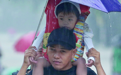 فلبيني يحمل ابنته فوق كتفه تحت أمطار غزيرة في مدينة ماريكينا بالقرب من مانيلا.