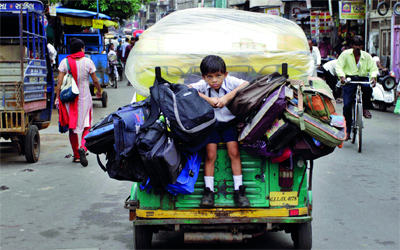 طفل هندي يتشبث بحقائب وضعت في مؤخرة عربة ثلاثية العجلات، التي تشحن أكثر من حمولتها، ويعاني أطفال المدارس قلة وسائل النقل، وتزداد المعاناة في موسم الأمطار.