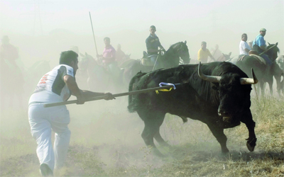 الإسباني سيرجيو ساكريستان يطعن ثوراً بالرمح تحت انظار العديد من الرجال على صهوات خيولهم، ضمن فعاليات المهرجان السنوي «تورو دي لا فيغا» في ضاحية توردسياس القريبة من مدينة بلد الوليد، والذي اصبح تقليداً سنوياً منذ عام ،1453 والذي طالبت جماعات الناشطين في حقوق الحيوانات بحظره، لما يتضمنه من ممارسات وحشية ضد الثيران.