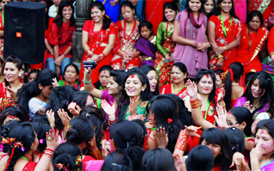 حشد من النساء الهندوسيات تجمعن في معبد باشوباتيناث في كاتماندو عاصمة نيبال استعداداد لأداء احدى الرقصات في اطار فعاليات مهرجان '' تيـج '' التي تتضمن رقصات وصلوات وطقوسا تدعو فيها المتزوجات الآلهة ان تجعل حياتهن الزوجية سعيدة بينما تدعو العازبات ان تمنحهن ازواجا صالحين .