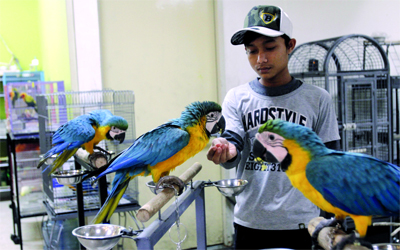 طفل صغير يطعم طيور الببغاء في سوق شعبية في العاصمة الإندونيسية جاكارتا.