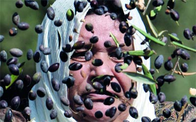 امرأة فلسطينية تتناول غصن زيتون في الضفة الغربية، إذ يتم قطف الزيتون في المزارع الفلسطينية في شهر اكتوبر من كل عام. ويستخدم المزارعون المحصول لإنتاج زيت الزيتون.