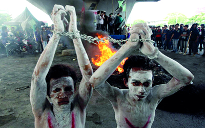 طالبان إندونيسيان يؤديان مشهداً تمثيلياً عن الفساد الحكومي في مكسر بمنطقة جنوب سولاويسي في اندونيسيا، وذلك ضمن الاحتفالات باليوم العالمي لمناهضة الفساد.
