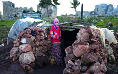 طفلة سورية تقف إلى جانب ملجأ مؤقت في أطراف مدينة سرجيلا الأثرية، شمال غرب البلاد، واضطرت إلى الهروب من مسقط رأسها مع عائلاتها بعد احتدام المعارك بين الفصيلين المتنازعين.