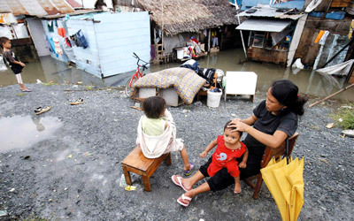 امرأة مع أطفالها تنتظر انحسار المياه في ضواحي العاصمة الفلبينية مانيلا، وقد ضرب إعصار قوي البلاد قبل أيام وأغرق قرى كاملة وشرد الآلاف من الناس.