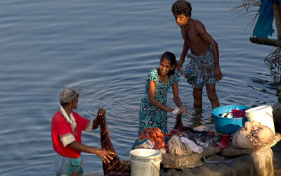 عائلة سريلانكية تغسل الملابس على ضفاف نهر كيلاني بالقرب من العاصمة كولومبو، ويستخدم الكثير من الأهالي المصادر الطبيعية للمياه بما في ذلك الأنهار والبحيرات بشكل يومي.أ.ب