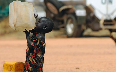 طفلة تشرب آخر القطرات من دلو ماء في معسكر تابع للأمم المتحدة في جنوب السودان، حيث تعيش برفقة مئات النازحين منذ أشهر هرباً من هجمات قبيلة الدينكا. أ.ف.ب