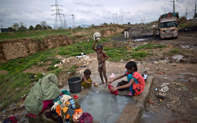 زليخة ستار (يسار) وابنة أخيها نورين (يمين) تغسلان الملابس بينما يستحم ابن زليخة، محمد (8 سنوات)، بالقرب منهما في ضواحي إسلام آباد. ويواجه سكان باكستان شحاً في المياه العذبة بسبب انخفاض منسوب المياه في السدود. أ.ب