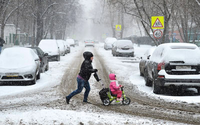 امرأة مع طفلها تقطع طريقاً مكسواً بالثلوج في موسكو. وشهدت روسيا موجة دافئة قبل أيام، قبل أن تنخفض درجة الحرارة أمس في موسكو إلى ما دون الصفر.