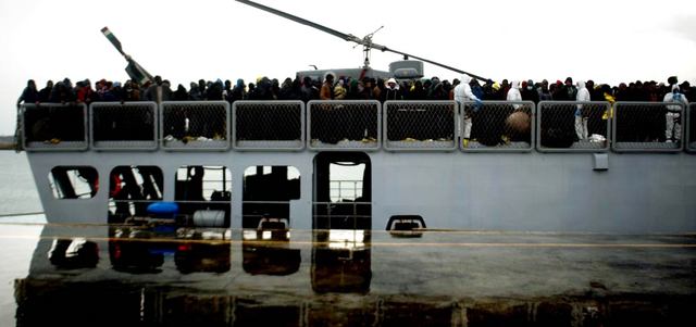 مهاجرون غير شرعيين ينتظرون إنزالهم على سواحل صقلية في إيطاليا. وقد أطلقت السلطات الإيطالية حملة واسعة لانقاذ مئات المهاجرين العالقين في البحر.