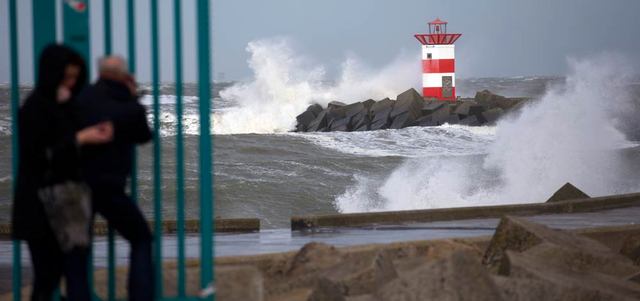 مشهد من عاصفة قوية تضرب ساحل «شيفنينغ» في هولندا، ووجد سكان المدن الساحلية صعوبة كبيرة في التنقل خلال الأيام الماضية، بسبب الرياح العاتية. أ.ب