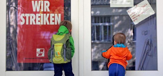طفلان ينظران من خلال زجاج روضة أطفال في مدينة ليبزيغ الألمانية، وقد أعلن عمال عدد من رياض الأطفال إضراباً مفتوحاً في أنحاء متفرقة من البلاد، للمطالبة بتحسين ظروفهم وزيادة رواتبهم.