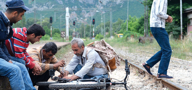 مهاجرون يصلحون دراجة على سكة حديدية بالقرب من اديمي كابيب في مقدونيا. ويحاول عدد من القادمين من سورية وباكستان وأفغانستان الوصول إلى أوروبا الغربية براً. وتنوي المجر بناء جدار عازل بينها وبين صربيا لمنع تسلل المهاجرين.