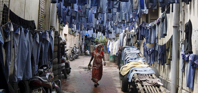 امرأة تمشي تعاين سراويل الـ«جينز» المستعملة بعد غسلها بأحد المنازل في كالكوتا الهندية، في انتظار بيعها في الأسواق المحلية. وتنتشر إعادة استخدام الألبسة في الهند بسبب الفقر وغلاء السلع الأصلية.