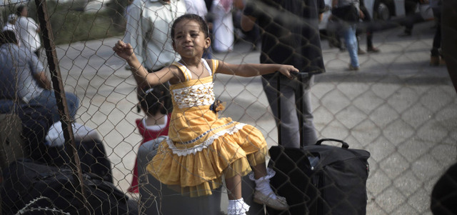 طفلة فلسطينية تنتظر مع أهلها عند معبر رفح للدخول إلى مصر. ومن المتوقع أن تفتح السلطات المصرية المعبر الحدودي بشكل مؤقت لمدة ثلاثة أيام.